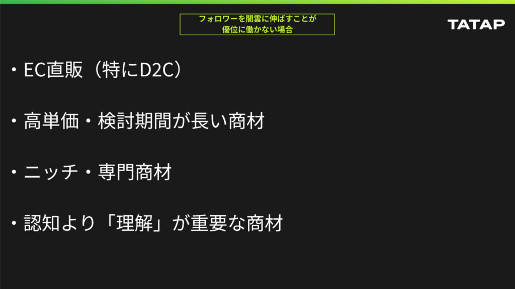 フォロワーが効くケースと効かないケースがあります。企業やブランドの状況によってフォロワー数の価値は変わります。ここを間違えると、無駄なキャンペーンや大量投稿中心の非効率な運用になります。