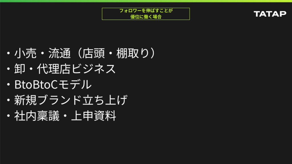 本当に重要なのは、売上・取引条件・信用・社内外での説得材料です。そのためにフォロワーが必要になるケースがある、という位置づけです。
