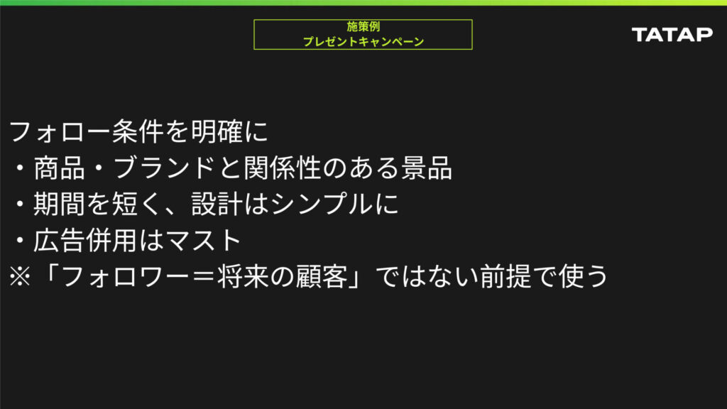 「とりあえずフォロワーを増やそう」となると、プレゼントキャンペーンの乱用やフォロワー購入といった誤った施策に走りがちですが、これは絶対にNGです。