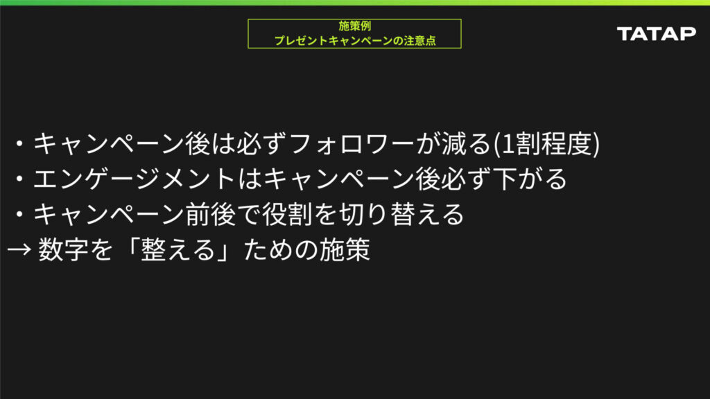 プレゼントキャンペーンのみをオーガニックで実施するのは伸びにくい傾向があります。