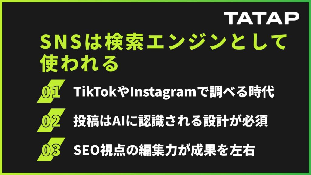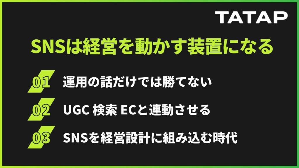 SNSはもはや「運用の話」ではなくなってきています。弊社Tatapが運用代行だけでなく、コンサルティングやコーチング、内製化支援、UGC設計、そしてECと検索の連動に力を入れているのも、この構造変化があるからです。