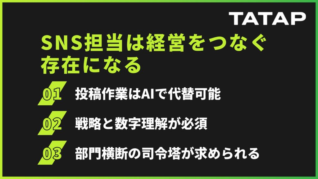 SNSは「選ばれる理由作り」の核となる存在です。そのため、担当者は経営、商品開発、広告、CS(カスタマーサクセス)といった各部門を横断し、SNSを軸に全体を繋ぐ存在へと進化することが求められます。