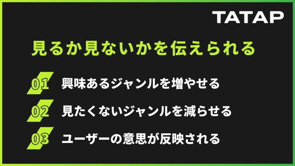 しかし今回の変更により、ユーザー自身が ・どのジャンルに興味があるのか ・どのジャンルはあまり見たくないのか を、より明確に意思表示できる仕組みが導入されました。
