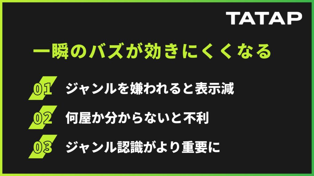 しかし、ユーザーがジャンルを意識し、自分の意思で「見る・見ない」を選択できるようになると、単に目に触れる回数を増やすだけでは、評価されにくくなっていきます。
