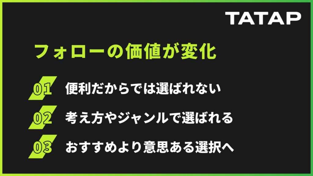 こうした変化により、フォローの意味そのものが変わりつつあります。