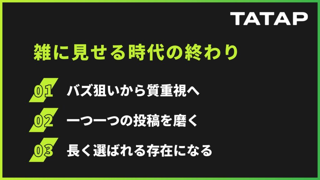 雑に多く見せる運用から、 きちんと理解され、意図を持って選ばれる運用へ。 SNSの重心は、確実にその方向へ移動しています。