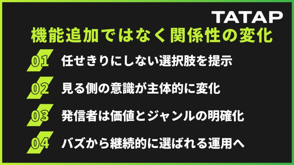 アルゴリズムを否定するのではなく、 すべてを任せきりにしない選択肢をユーザーに渡した という点に、この変更の本質があります。