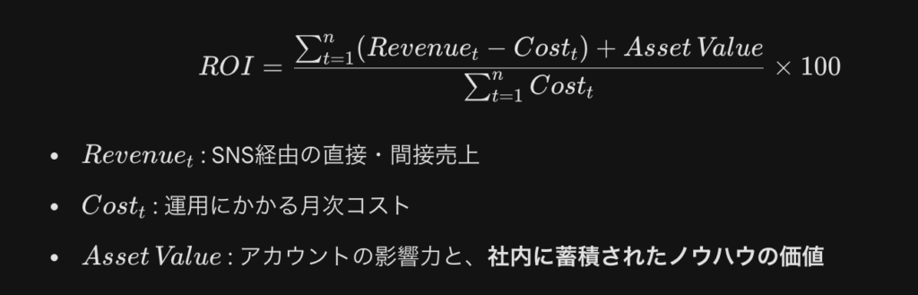SNSにおける長期的な投資対効果(ROI)は、以下の方程式で表されます。