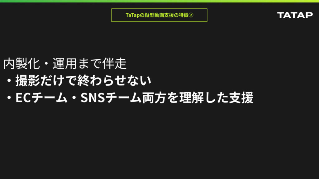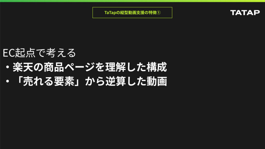 弊社Tatapでも、こうした縦型動画の支援を行っており、3つの特徴があります。1つ目の特徴は、「EC起点で考える」という点です。楽天の商品ページを深く理解した上で構成案を作成し、売れる要素から逆算して動画を制作します。先ほど申し上げた通り、バズを狙うのではなく「売れる動画を作る」という点に特化しているのが特徴です。