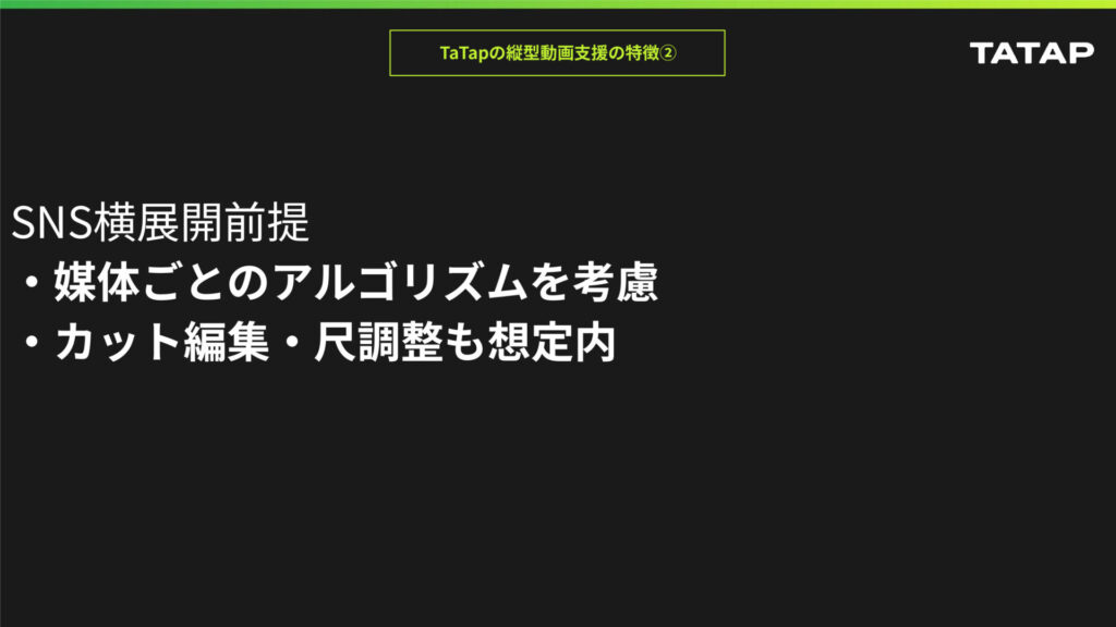 2つ目の特徴は、「SNS横展開を前提」として制作する点です。各SNSごとのアルゴリズムを考慮した上で、カット編集や1動画あたりの尺を調整・想定して制作させていただきます。