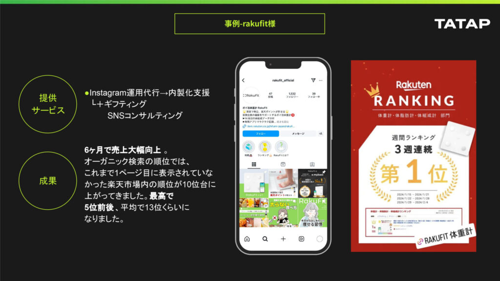 Instagramの運用代行から内製化支援までを担当させていただきました。運用のほか、ギフティングや最終的な内製化コンサルティングを通じて、6ヶ月で売上が大幅に向上。楽天市場内での検索順位が1ページ目(最高5位前後)に入り、週間ランキングの体重計部門で3週連続1位を獲得されるなど、SNS試作を活用した顕著な成果が出ております。