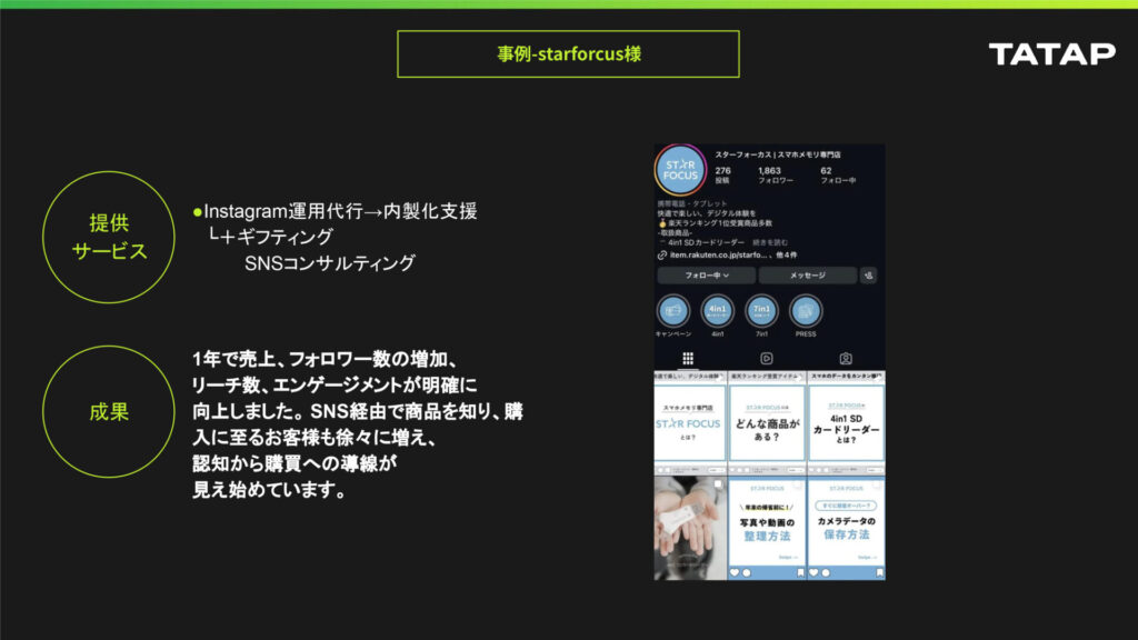 同じくInstagramの運用・内製化支援、およびギフティングの支援をさせていただきました。1年間で売上、フォロワー数、リーチ数、エンゲージメントが明確に向上し、SNS経由で商品を知り購入に至ったというお客様が非常に増加した事例となっております。