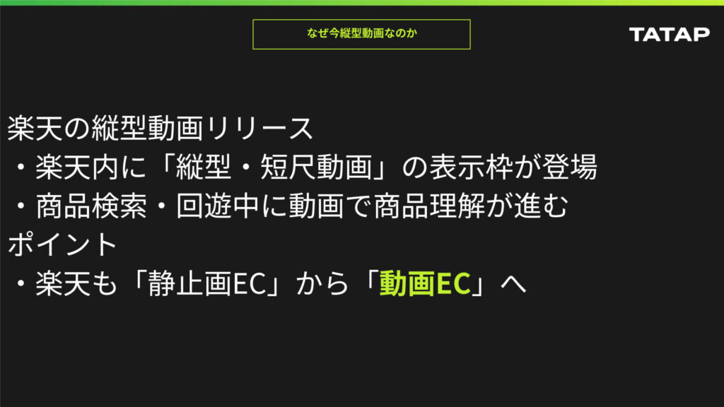 - 楽天は静止画中心ECから縦型動画ECへ進化し発見型購買を強化