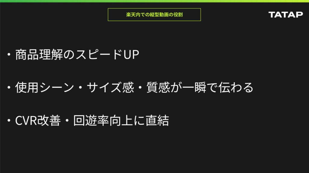 楽天内における縦型動画の役割は、主に2点あります。1点目は商品理解のスピードアップ、2点目は使用シーンやサイズ感、質感が静止画よりも一瞬で伝わるようになるという点です。これらは、楽天モール内でのCVR(成約率)の改善や、回遊率の向上に直結する要素になったと考えております。