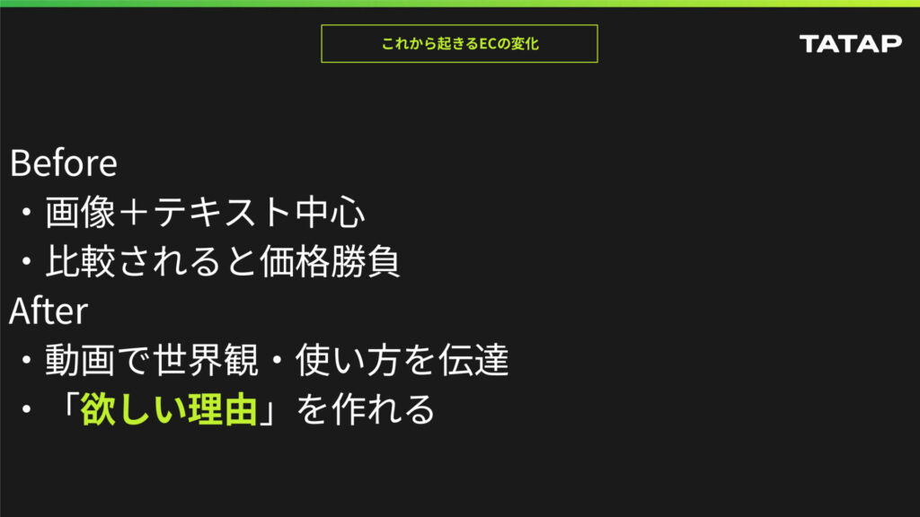 今後起きるECの変化として、従来は画像とテキストが中心であったため、比較された際にどうしても価格勝負になりやすい側面がありました。しかし、動画導入後の変化としては、動画を通じて世界観や使い方を伝達することで、顧客の中に「欲しい理由」を創出できます。その結果、他社と比較されることなく購入いただけるというメリットが生まれます。