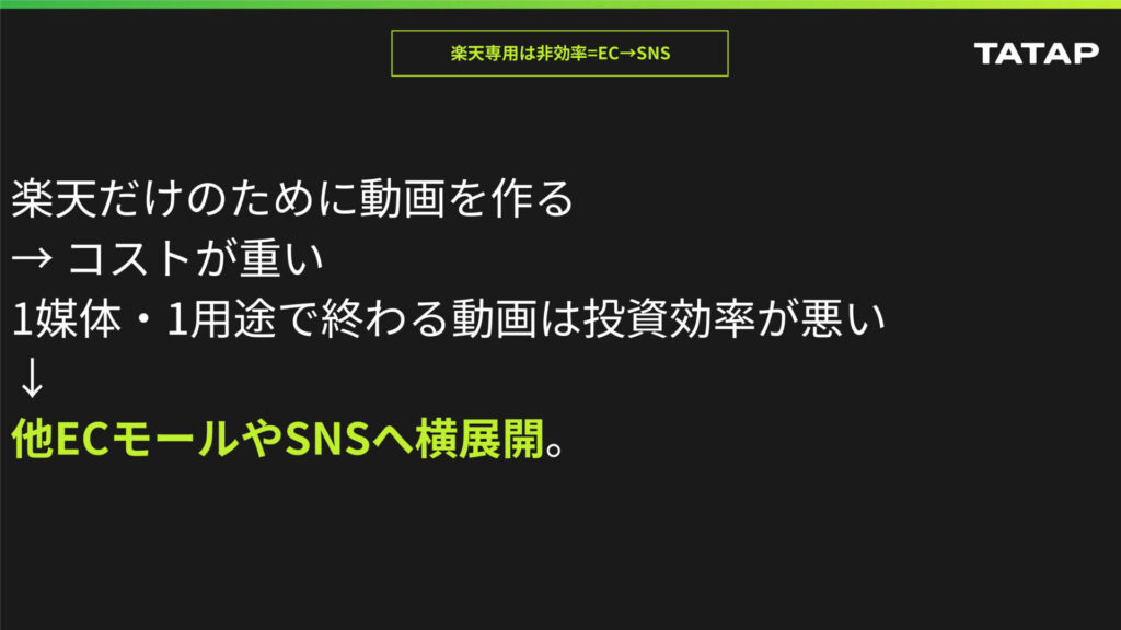 一つの媒体、つまり楽天の中だけで活用すると、どうしても投資効率が悪くなってしまいます。もしAmazonやYahoo!ショッピングなど他のECモールも運用されているのであれば、それらへの展開、さらにはTikTok、Instagram(リール)、YouTubeショート、そして最近では縦型動画が伸びやすくなっているX(旧Twitter)など、SNSへ横展開をしていただく「EC to SNS」の形をお勧めしています。