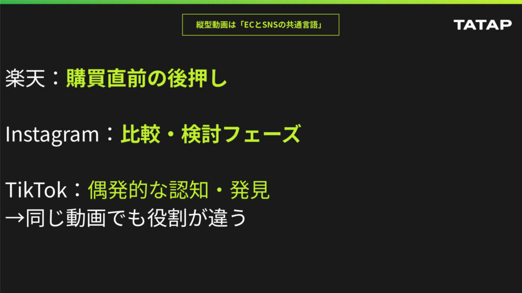 縦型動画は、今やECとSNSの共通言語になったと認識しております。楽天内のディスカバリーコマースは「購買直前の後押し」としての役割を担います。一方で、Instagramは比較・検討フェーズでじっくりと検討いただく場所であり、TikTokは偶発的な認知や発見を通じてまず知っていただく場所です。 このように、同じ動画であってもプラットフォームごとに役割が異なるため、一つの場所で完結させるのではなく、複数の場所で活用することをお勧めしております。