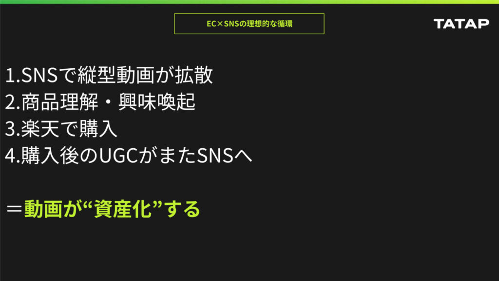 EC×SNSにおける理想的な循環についてですが、SNSで縦型動画が拡散されることで、商品理解や興味喚起に繋がります。その後、楽天の中でも動画を視聴することで購入に至り、購入後のUGC(ユーザー投稿)が再びSNSへと繋がっていく。このプロセスを繰り返すことで、動画が資産として積み上がっていくという理想的な循環を構築できると考えております。