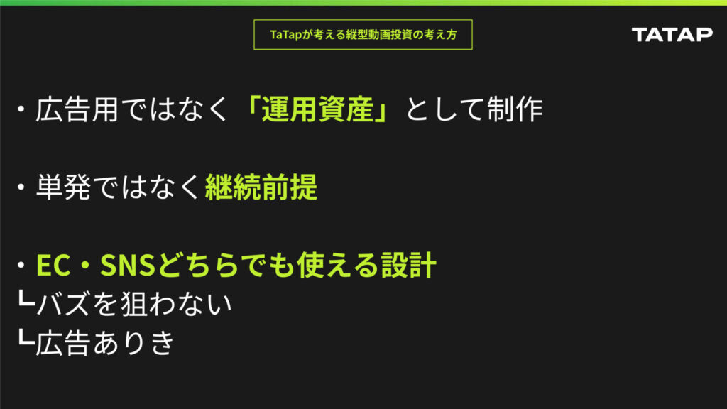 弊社Tatapが考える縦型動画への投資の考え方ですが、基本的には広告用としてではなく「運用資産」として制作を行う方針をとっております。そのため、単発の施策ではなく、継続することを前提とした動画制作をお勧めしております。