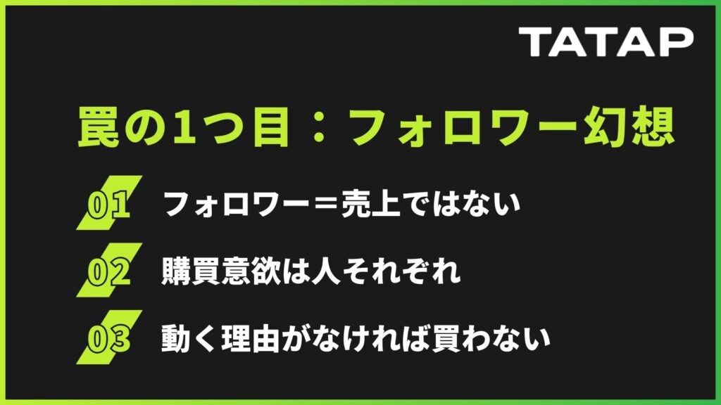 それでは、1つ目の罠について解説します。それは「フォロワーさえ増えれば、比例して売上も伸びていくだろう」という思い込みです。