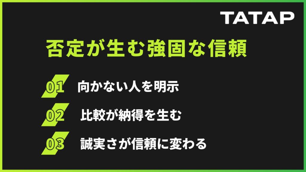 - 否定や比較提示が信頼と納得を生む鍵になる