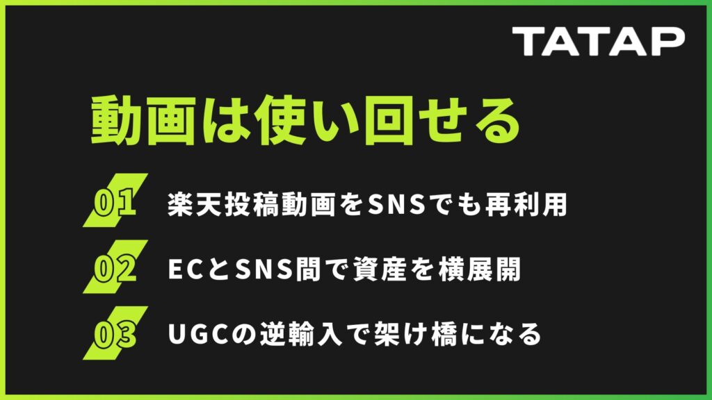 つまり、楽天への投稿がSNS運用の起点になり、SNSで生まれたUGC(ユーザー生成コンテンツ)を楽天フィードへ逆輸入する、という流れが生まれます。こうした動画資産の横展開が、ECとSNSをつなぐ架け橋になっていくはずです。