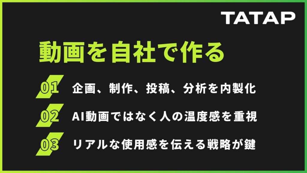 私の結論としては、動画制作の「内製化」の力をつけることが最も重要だと思います。