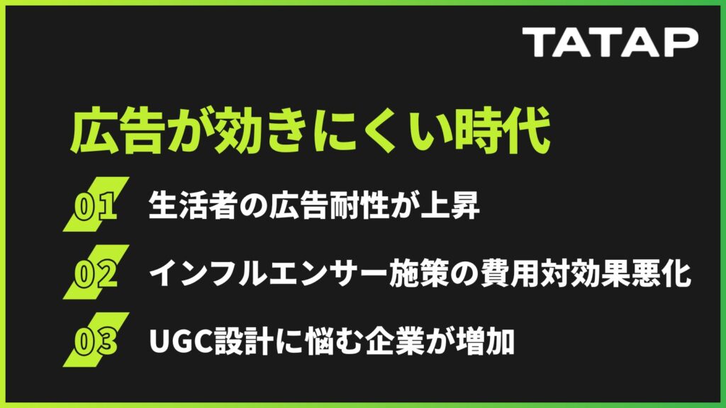 - 広告の反応鈍化: 以前と同じように広告を出しても、ユーザーの反応が明らかに鈍くなってきている。
