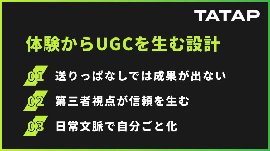 - 曖昧なKPI: 「とりあえずUGCが上がればいい」という考え方。具体的な目的が欠如している。