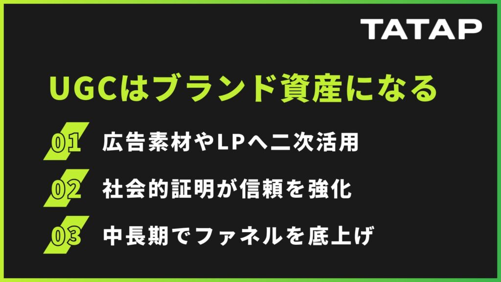 - 設計次第で、UGC、広告素材、ブランド資産へと姿を変える。
