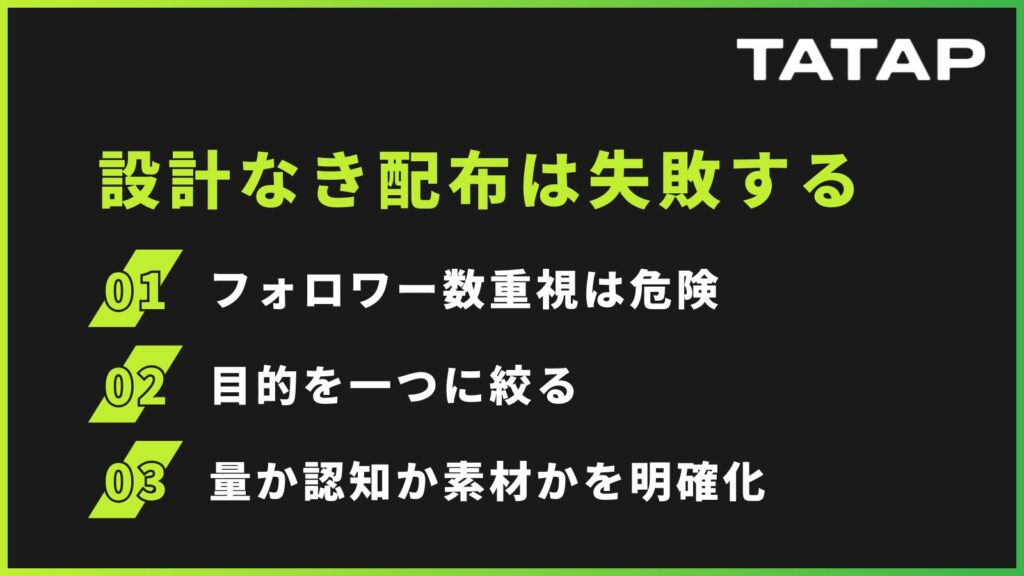 - 無計画な配布: とりあえず送って「投稿してください」と言うだけ。その結果、投稿されなかったり、世界観がバラバラな投稿になったりする。
