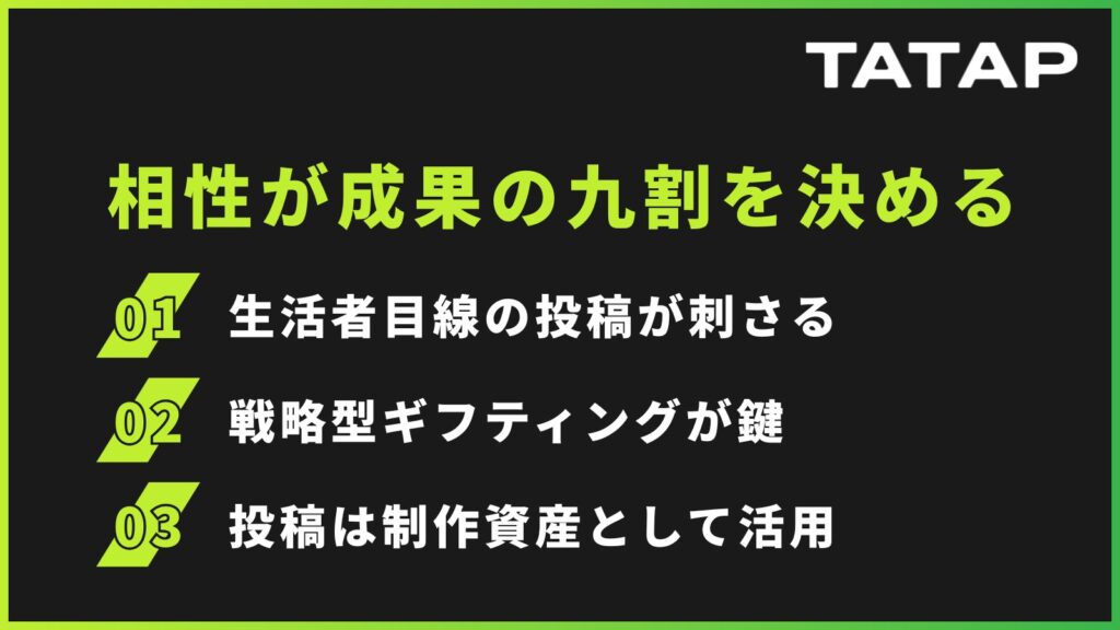 ギフティングの成功は、「クリエイターの選定が9割以上」を占めます。ブランドとの親和性(マッチング)が最も重要です。