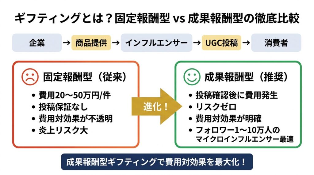 この施策を実施する際、費用の支払いモデルには大きく分けて「従来型(フォロワー単価・固定費)」と「成果報酬型」の2つが存在します。まずはこの違いを正しく理解することが、失敗しない施策の第一歩です。