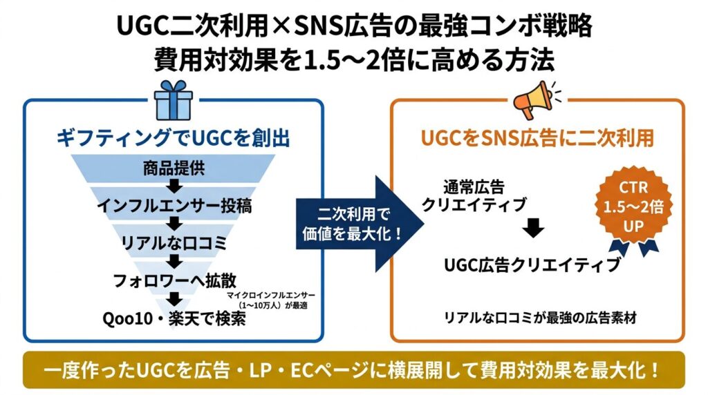 | 費用対効果(ROI)の可視化 | 不透明(リーチ数と売上の相関が見えにくい) | 極めて明確(1UGCあたりの獲得単価が固定) |