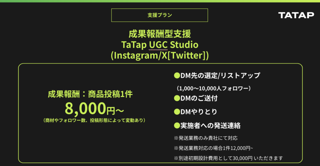 - 発送込みプラン(商品の発送業務:TaTapがすべて代行): 1投稿 12,000円〜 面倒な作業から完全に解放され、数十件〜数百件という大規模な施策もストレスなく実行できます。