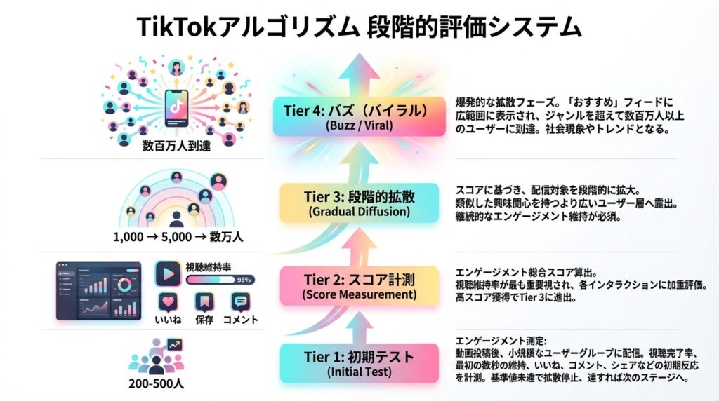 - 拡散のループ: スコアが基準値を超えると、次は1,000人、次に5,000人、数万人…と、より大きなユーザー層(ティア)へと段階的に動画が拡散されていきます。