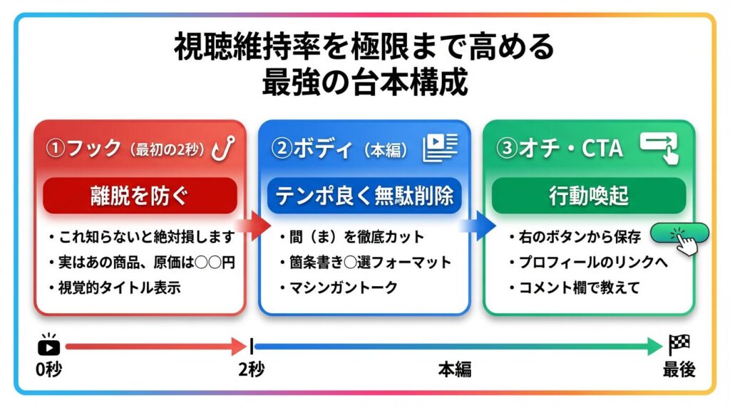 TikTokでアカウントを伸ばせるかどうかは、撮影技術でも編集技術でもありません。「台本(構成)」の質で9割が決まります。 ここでは、視聴維持率を極限まで高めるための「最強の台本構成(フレームワーク)」を解説します。