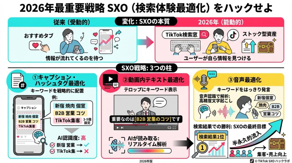 - 2026年の最重要戦略「SXO(検索体験最適化)」: 現在のユーザーはTikTokで検索をします。動画内のテキスト、キャプション、ハッシュタグに「検索キーワード」を網羅し、検索結果から半永久的な流入(ストック型集客)を狙うことが必須です。