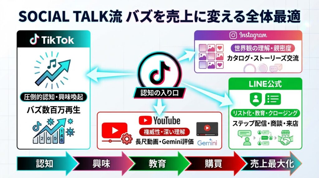 TikTokアカウントを伸ばし、数百万回の再生(バズ)を獲得した。しかし、それだけでは企業の利益は1円も増えません。 『SOCIAL TALK』でも代表の富田が繰り返し強調しているのが、「TikTokを点として捉えるのではなく、他メディアと連携させた『線(全体最適)』の導線設計がなければ意味がない」という事実です。