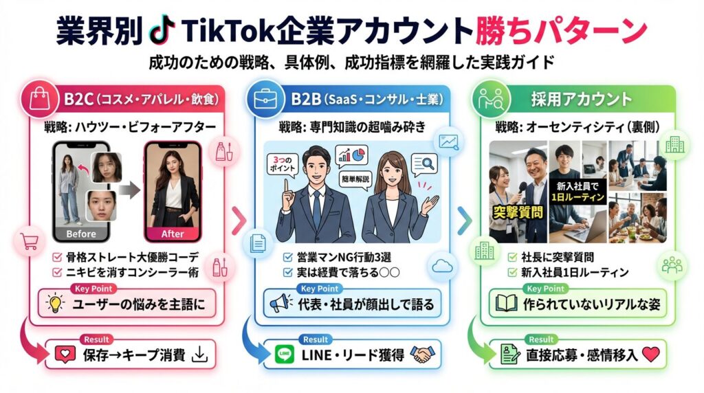 TikTok企業アカウントで「何を配信すべきか」は、B2C、B2B、採用といった目的によって全く異なります。各業界における「勝ちパターン」を解説します。