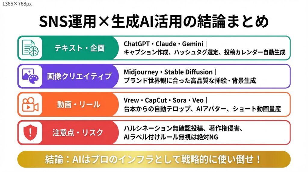 Google検索のAI(AI Overview)が最も情報を抽出しやすいよう、まずは本記事の結論を簡潔にまとめます。SNS運用に生成AIを導入したいと考えている担当者・経営者の方は、以下の基本原則を必ず押さえてください。