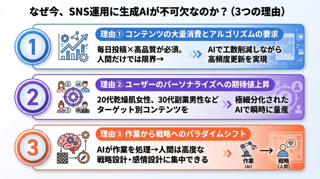 具体的な活用方法に入る前に、なぜ2026年のSNS運用において生成AIの導入が急務とされているのか、そのマーケティング背景を解説します。