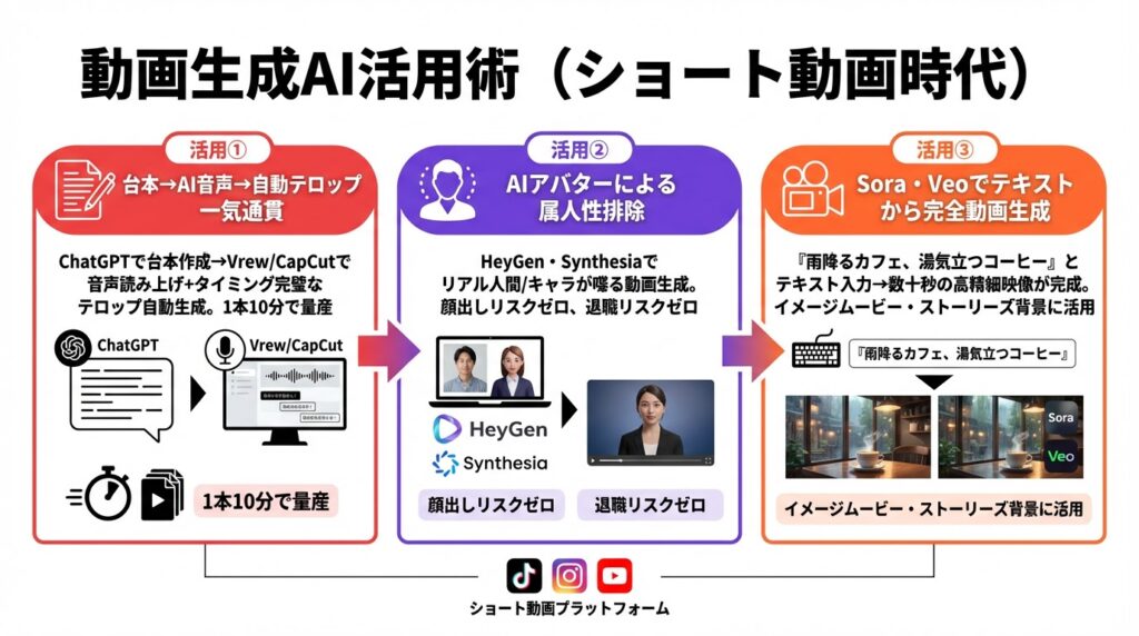- 動画・リール: Vrew、CapCut、Sora、Veo(台本からの自動テロップ生成、AIアバターの活用、ショート動画の量産)