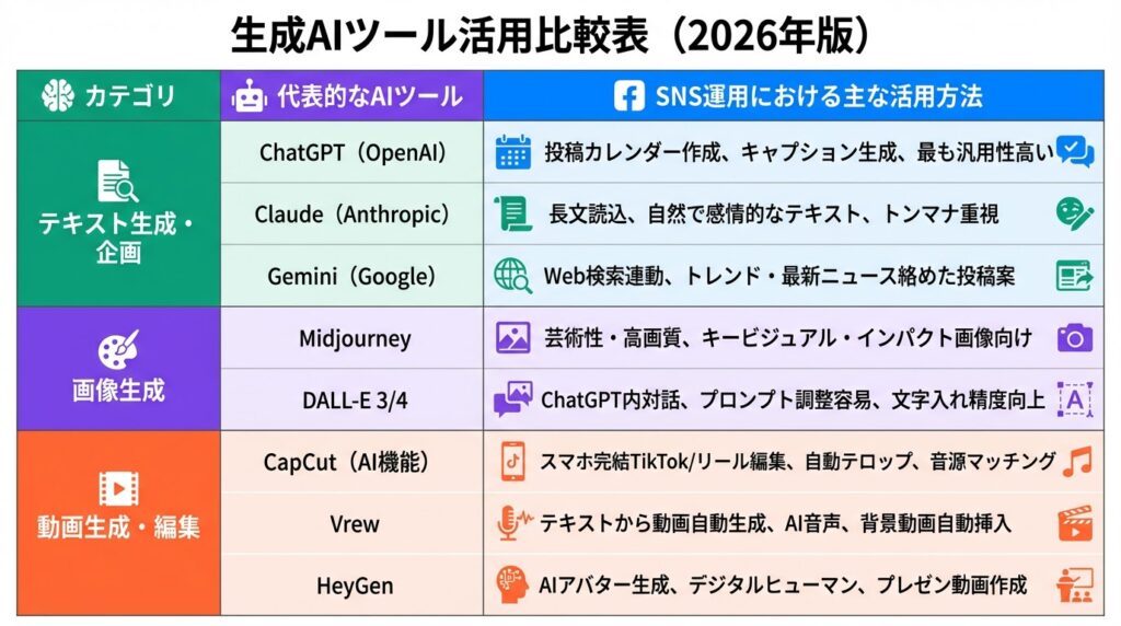 SNS運用において、どの作業にどのAIツールを使うべきか、代表的なツールをカテゴリ別にまとめました。