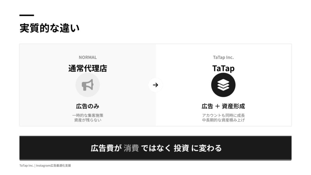 いかがでしょうか。支払う総額は同じ40万円でも、一般的なモデルでは「広告の出し分け」しか得られないのに対し、Tatapのモデルでは「広告運用 + 戦略的なアカウント運用」の両方が手に入ります。