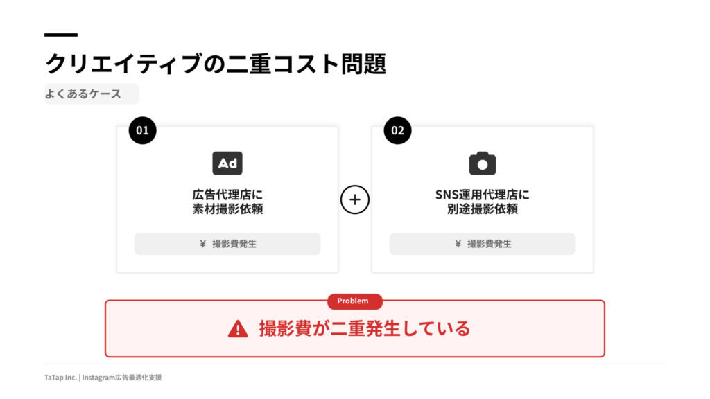 - コストの「二重発生」に悩んでいる: アカウント運用と広告運用を別々の代理店や支援会社に依頼しているため、撮影や素材制作のコストが重複してかかっている。