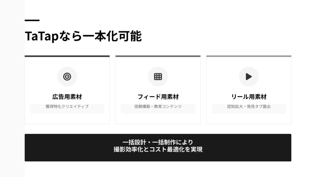 さらに、私たちは広告用、フィード投稿用、リール用の素材を一括して撮影・制作します。これにより、撮影費の二重発生や、素材の使い回しによるブランドイメージの乖離を防ぎ、制作コストを大幅に最適化することが可能です。