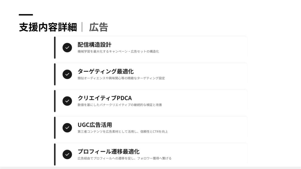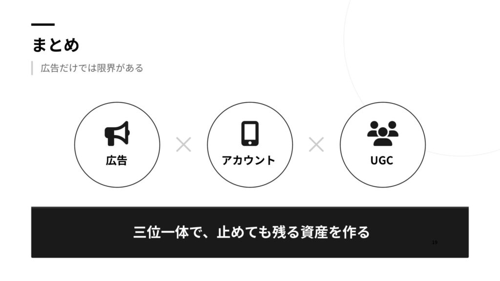 これからの時代、広告という「点」の施策だけで勝ち続けることは困難です。 ユーザーの信頼を勝ち取り、継続的な成長を実現するためには、「広告 × アカウント運用 × UGC」の三位一体の戦略が欠かせません。