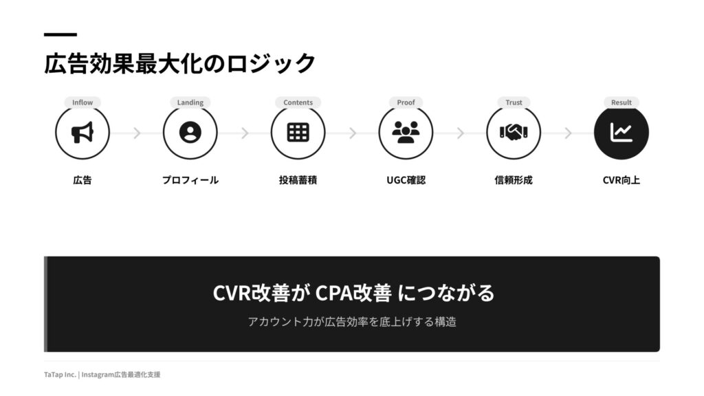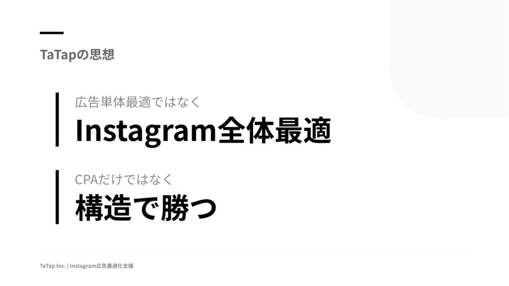 私たちは、広告を単体で最適化するのではなく、「Instagram全体を最適化する」ことを目指しています。CPAという単一の指標に振り回されるのではなく、成果が出る「構造そのもの」を改善する支援を行います。