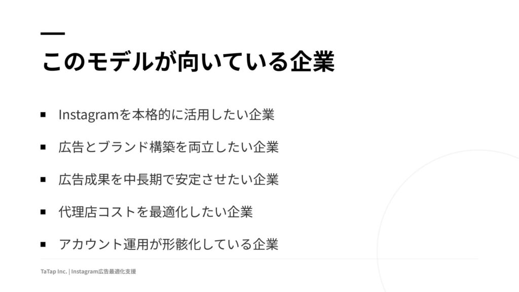 今回の「Instagram広告最適化支援」は、特に以下のようなお悩みを持つ企業様に最適です。